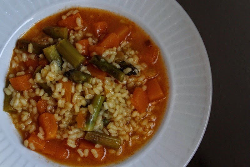 Un manojo de espárragos, 200gr de calabaza, una taza (tamaño: café con leche) menos un dedo de arroz, 2 dientes de ajo, 2 tomates rallados, una cucharada de pimenton dulce o colorante, sal, aceite de oliva. Agua o caldo.