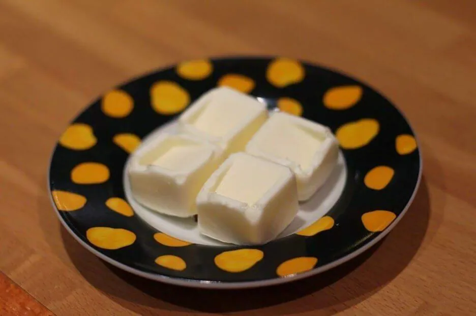 Ponemos el queso junto con la nata o la lecha en un cazo al fuego, y damos vueltas hasta que el que se se integre por completo. Mientras, en un cuenco con agua fría habremos puesto la hoja de gelatina para que se hidrate. Cuando el queso esté integrado, añadimos la hoja de gelatina bien escurrida y damos unas vueltas, para que se deshaga y quede en la mezcla disuelta. A continuación, rellenamos el molde de los bombones, con cuidado, y guardamos en el congelador para que se endurezcan. Yo he elegido este molde con formas de Cubo de Silikomart, que son muy fáciles y cómodos de desmoldar. Al congelarlos, podemos dejarlos el tiempo que queramos y cuando tengamos alguna comida o cena, con sacarlos un rato antes, desmoldarlos y servirlos, sobrara. Desmoldamos en frío y en unos minutos, se quedan cremosos.