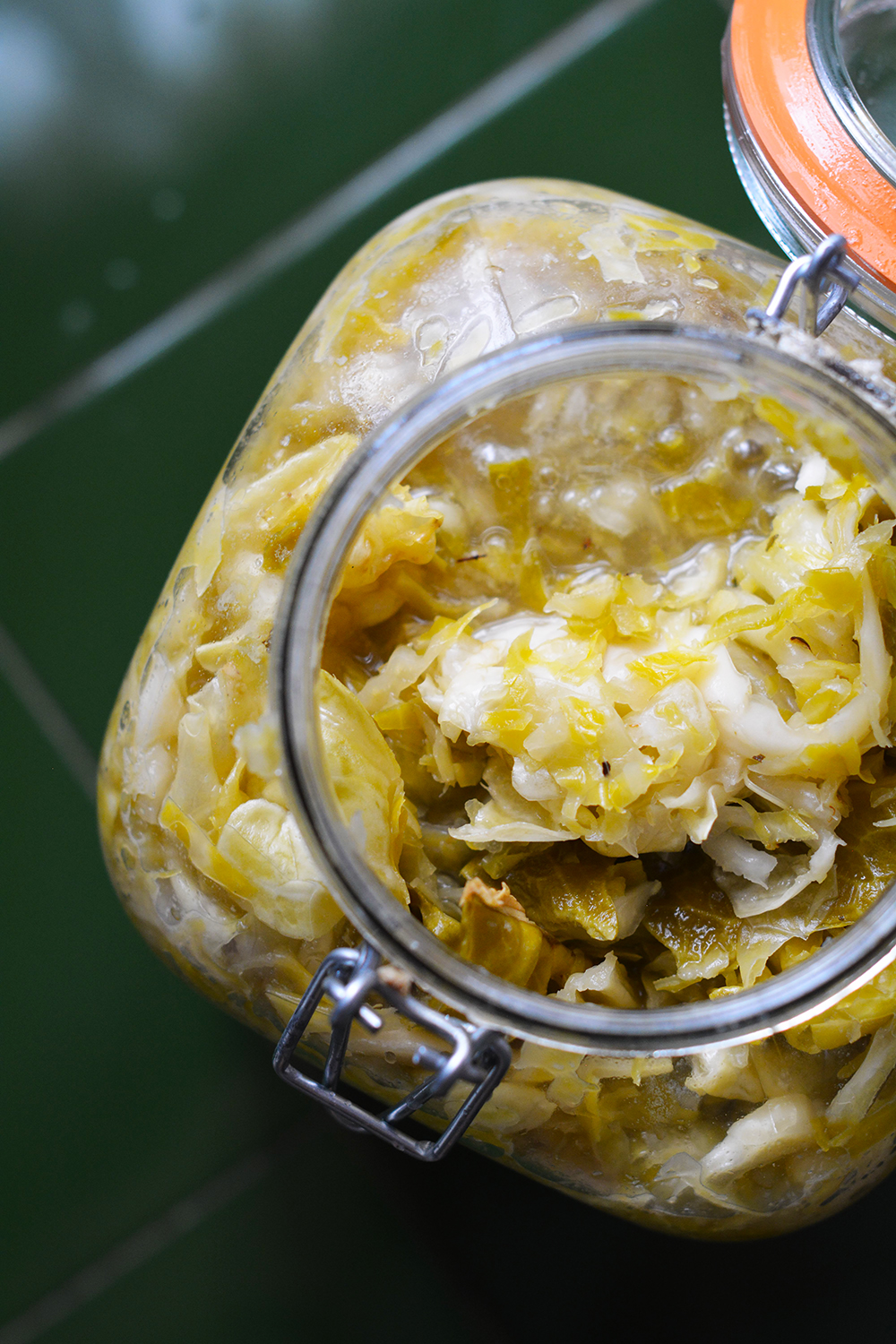 En un tarro hermético comenzaremos a colocar la col por capas, presionando muy bien, este paso es muy importante para que la fermentación sea optima. Por último añadiremos toda el agua de la col y debe cubrir por lo menos dos centímetros por encima de la verdura. Un buen truco es reservar una hoja de col entera y colocarla una vez hayamos presionado bien toda la verdura, esto nos permitirá que el agua siempre este por encima. Otro truco es colocar un peso sobre la verdura. Cerraremos el tarro hermético y lo guardaremos en un sitio fresco a temperatura ambiente y que no tenga luz.