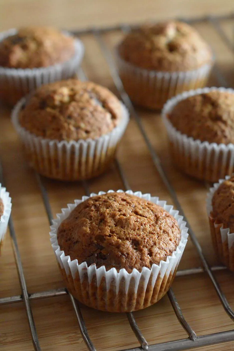 Mezclar el aceite con el azúcar, cuando esté integrado añadir los huevos. A continuación agregamos los ingredientes secos reservados y mezclar hasta conseguir una masa homogénea. Incorporar el plátano machacado y cuando este integrado, añadir las nueces troceadas y el chocolate. rellenar las cápsulas para magdalenas sus 2/3 partes si queremos hacer cupcakes, y hasta el borde si queremos hacer muffins o magdalenas. Hornear a 180C, calor arriba y abajo, unos 20-25 minutos.