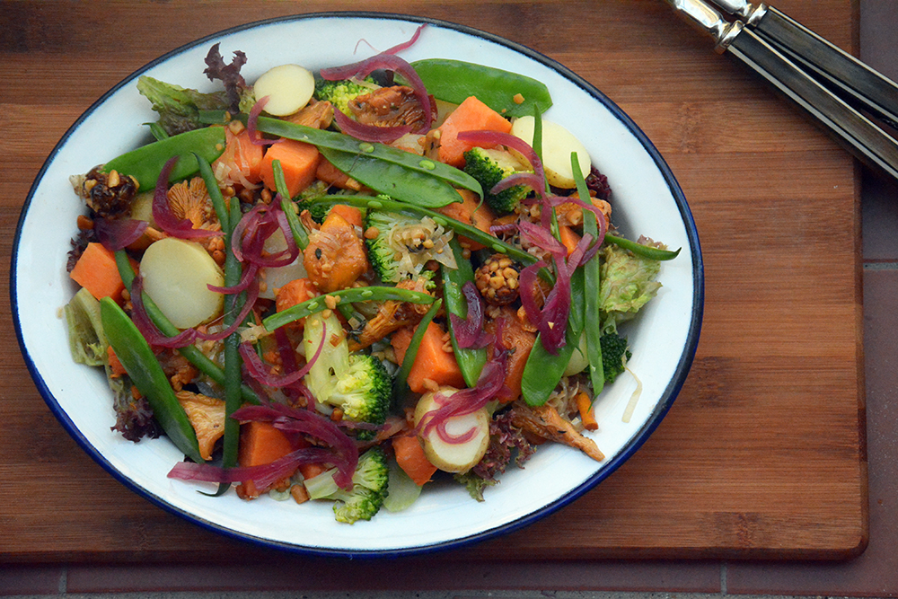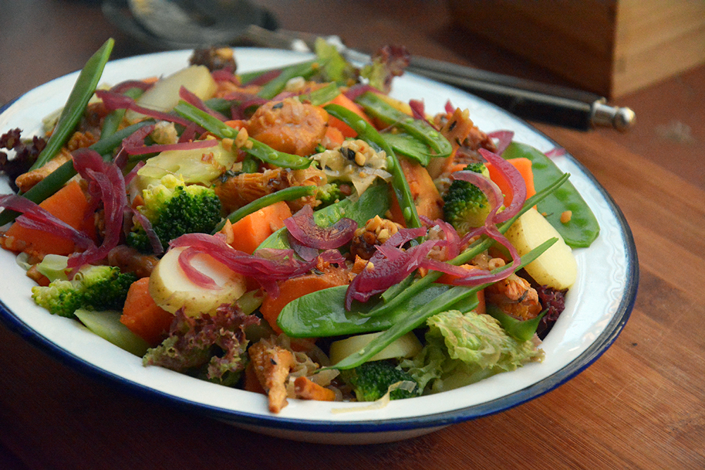 Cocer todas las verduras menos el boniato al dente, en una cacerola con agua hirviendo durante 2-3 minutos. Escurrir bien y reservar. Poner en una fuente una base de mezcla de lechugas, las que más os gusten, encima las verduras junto con los dátiles y aliñar con la vinagreta de mostaza.