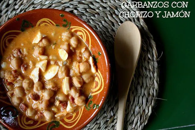 Los guisos de cuchara para mí son indispensables durante todo el año, aunque los haga con menos frecuencia con el buen tiempo, en casa, legumbres y sopas, son un elemento basico en la dieta, por eso hoy que hace un frío increible, he preparado estos Garbanzos con chorizo y jamon, un plato sencilla que nos gusta a todos