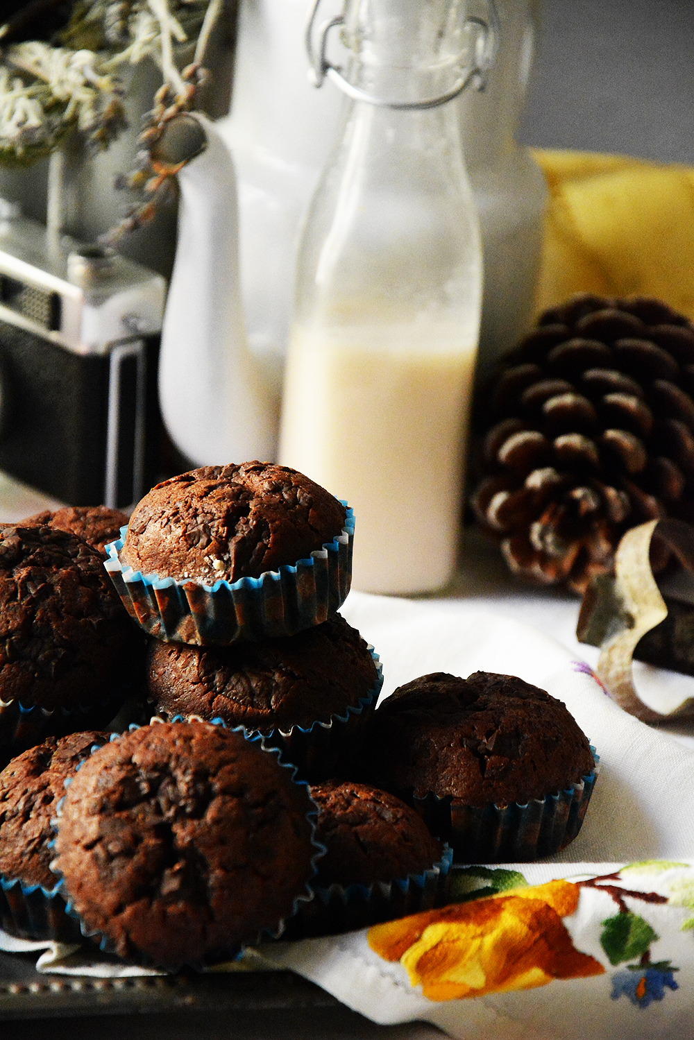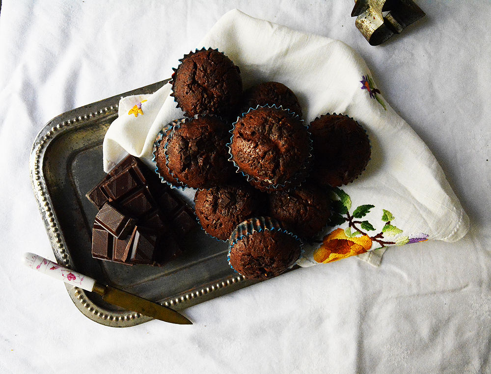 Cuando la mezcla anterior esta fría, en un bol ponemos los huevos con la leche y batimos bien. Le agregamos la mezcla de chocolate y cerveza y mezclamos hasta que se integren. Por ultimo, añadimos la harina y el bicarbonato y mezclamos hasta que quede una mezcla homogénea. Tendrá una textura líquida y brillante. Rellenamos las capsulas de las magdalenas, espolvoreamos cada magdalena con unos chips de chocolate y horneamos a 180C unos 25 minutos, hasta que estén cocidos.