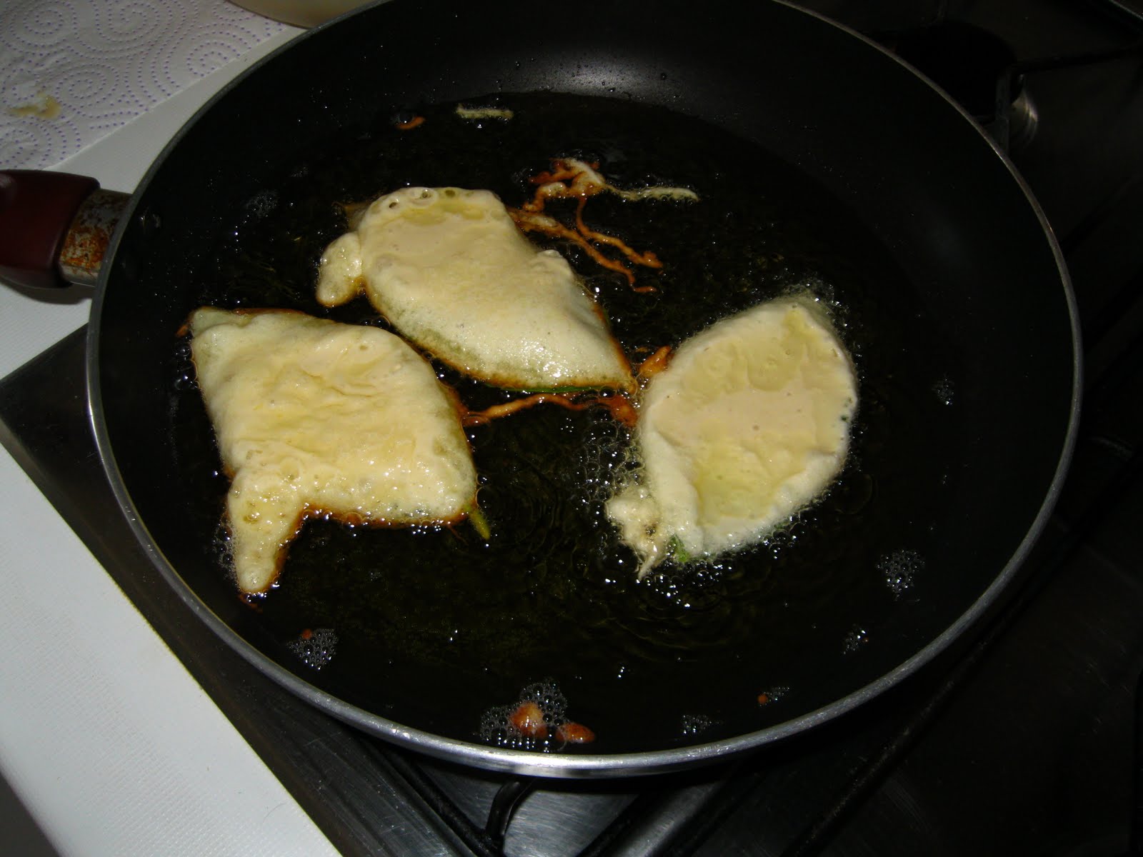 – Con el aceite caliente se van colocando uno a uno los buñuelos que forman la hoja rebozada en el interior de la sartén. Se deben voltear con cuidado para no desprender la masa de la hoja o bien poner aceite suficiente para que se doren por ambas caras.