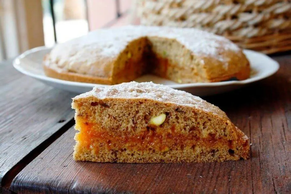 Horneamos en horno precalentádo a 180ºC, calor arriba y abajo, durante unos 20 minutos. Podemos hacer toda la masa junta y dividir el bizcocho en dos, o hornearlo en dos moldes de 20cm, dividiendo la masa por la mitad. Dejamos enfriar, y juntamos poniendo en medio una capa de mermelada/compota de albaricoque. Decoramos con azúcar glass.