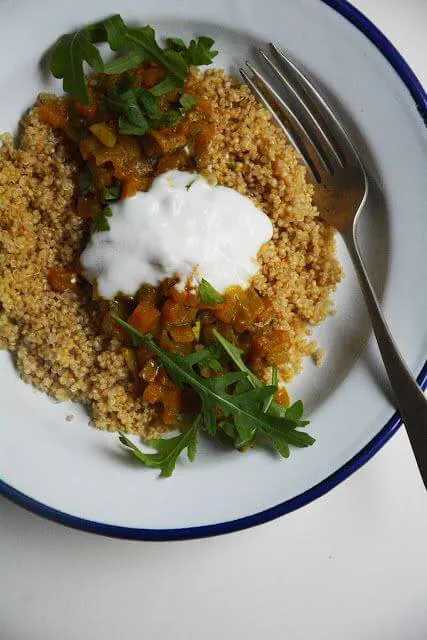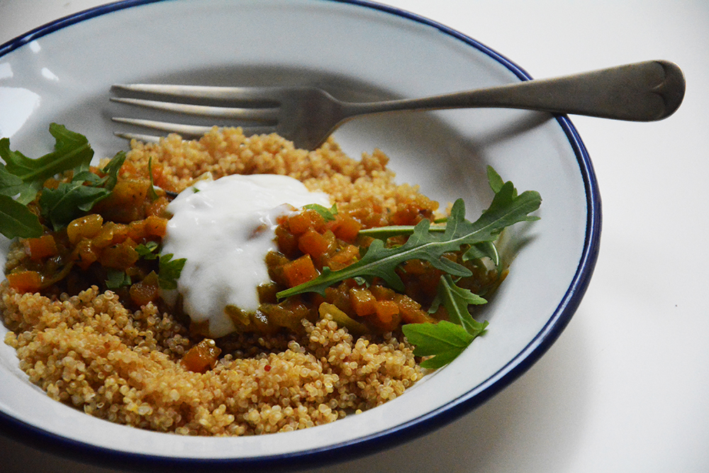Ultimamente me estoy aficionando a los currys, me resultan super atractivos y llenos de sabor y además podemos cambinarlos con cereales y dejar un plato super completo, hoy os dejo la receta de esta quinoa con curry de calabaza
