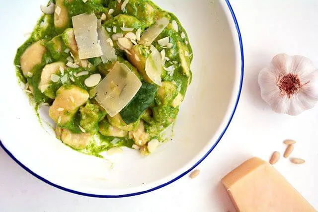 Para hacerlos, los cocemos en agua y los dejamos hasta que floten. Los pasamos por una sartén unos minutos y servimos con la salsa que más nos gusten. Yo esta vez elegí un pesto de espinacas, pero con el pesto tradicional quedan también deliciosos. (si pincháis en cada nombre os llevara a la receta)