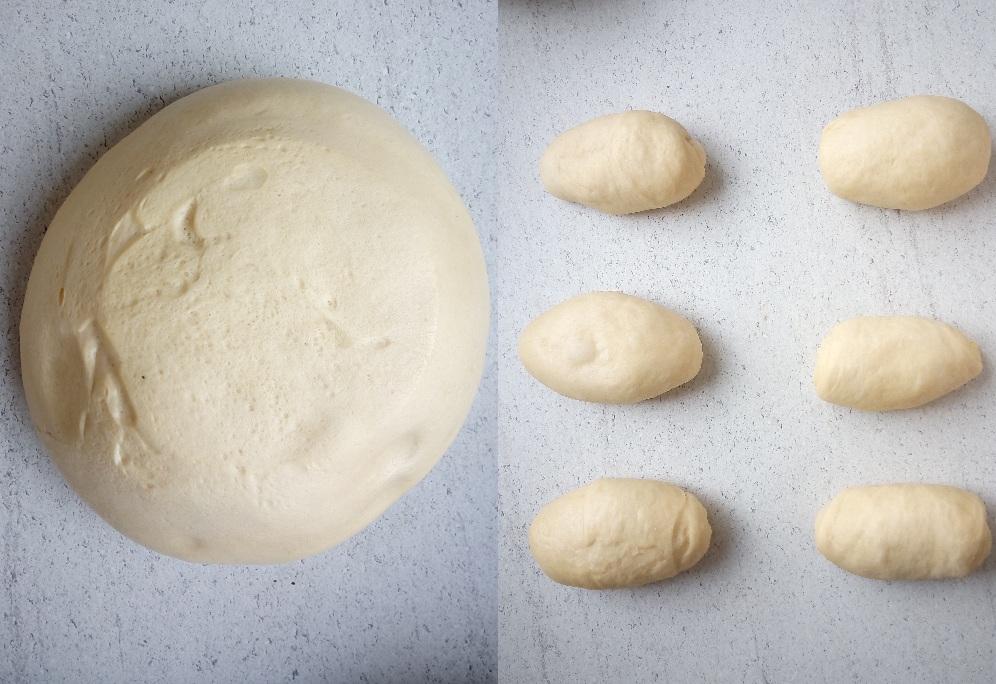 Desgasificamos con las manos la bola, ponemos en la superficie de trabajo y la dividimos en 6 porciones iguales. Trabajamos un poco para darle forma alargada, como veis en la foto, y dejamos reposar 5-10 minutos. Pasado ese segundo reposo, estiramos las 6 porciones de masa, alargandolas como cilindros. Deben quedar lo más homogéneas posibles. Y ahora tendremos que darle la forma de trenza. Para mí, el paso más complicado, y en el que falle. Podéis hacer una trenza de 3, que se realiza como una trenza del pelo, o de 6, como ésta. Y dejaremos reposar con la forma hecha durante otros 30-40 minutos, ya listo para hornear.
