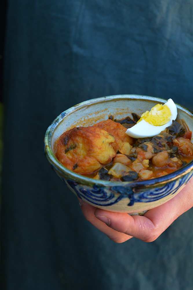 Cuando haya pasado la media hora apartemos del fuego la olla rápida y esperaremos que baje la presión, abriremos la tapa y lo volveremos a llevar a hervor. Agregar entonces el majado que habíamos elaborado anteriormente, esto hará que nuestro potaje se espese y por último las albóndigas de bacalao y las dejaremos cocer unos cinco minutos a fuego lento. Para coronar el potaje, un huevo duro como manda la tradición.