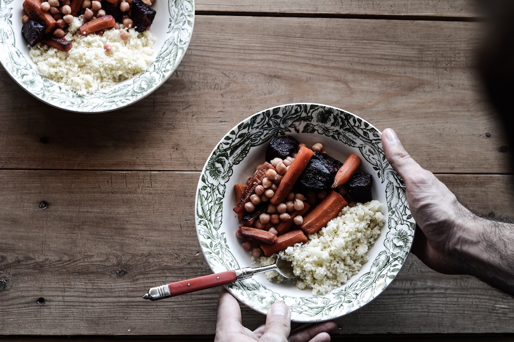 Por otro lado prepararemos el cous cous, calentaremos el agua hasta hervor y volcar sobre el cous cous, tapar con un paño y dejar que se hidrate unos 8 minutos. Retirar el paño y añadirle una gota de aceite de oliva aove para que quede separado.
