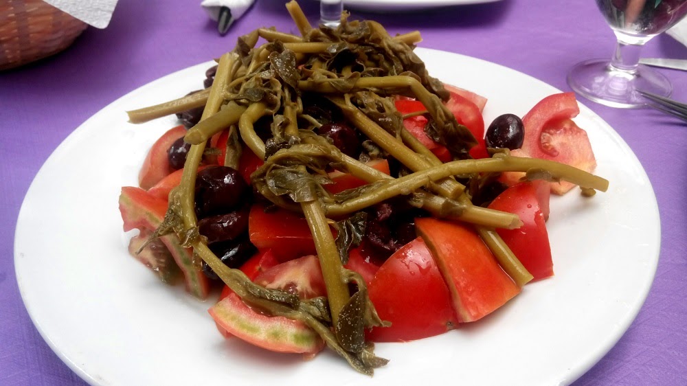 Para abrir boca, una ensalada de tomate partío, olivas negras – conocidas como cuquillos- y tallos. Para los que no sois de la zona, los tallos son las ramas de las tápenas. Encurtidas y se toman directamente. Y una tapa de champiñon plancha. Para mi gusto es uno de los mejores que he probado en mi vida, esta especial.