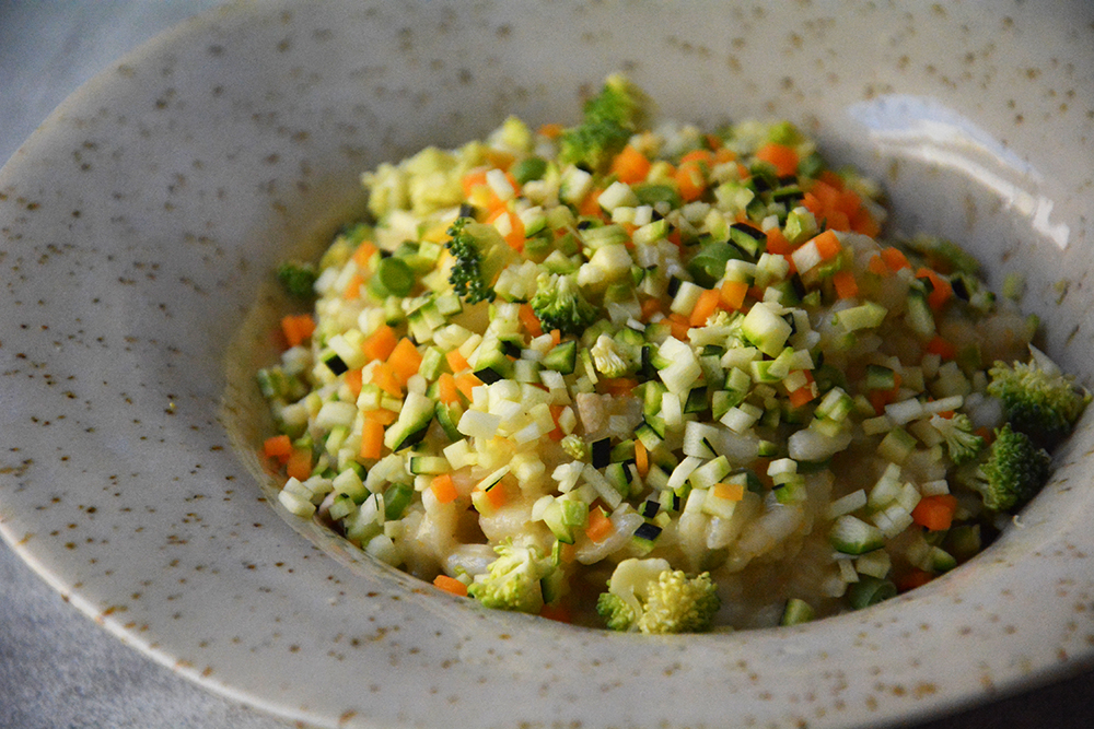 En una sartén ponemos el aceite de oliva y rehogamos unos minutos las verduras, sin que lleguen a dorarse. De todas las verduras, siempre reservo unas pocas crudas para la decoración final del plato, pero este paso es opcional. Incorporamos el arroz arborio y removemos 2 minutos más. Entonces, empezamos la elaboración del mismo. Añadimos caldo de verduras caliente, y sin parar de remover vamos dejando cocer hasta que se reduzca. Volvemos a incorporar más caldo, y removemos hasta que reduzca otra vez. Este proceso debemos de realizarlo durante los 14-15 minutos que tarda el arroz en llegar a su punto óptimo de cocción, que para el risotto, es al dente. Entonces, retiramos del fuego y le añadimos el queso parmesano rallado, la mantequilla en cubos y movemos bien, hasta que quede integrado y cremoso. Rectificamos de sal y Ya sólo nos quedara servirlo inmediatamente decorado con las verduritas que habíamos reservado.