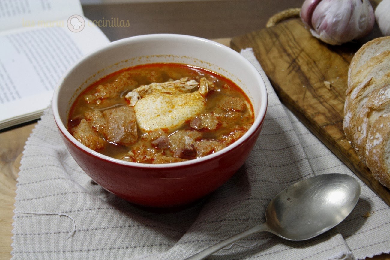 Un par de ajos, unos 50gr de jamón, una cucharada colmada de pimentón dulce o picante (o mitad de cada, según gustos) un huevo por persona, un par de rebanadas de pan de pueblo, unos 400 ml de caldo de pollo o cocido (prefabricado o casero) y una cucharada de aceite de oliva por persona para sofreir.